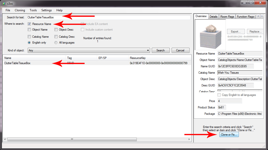 Type Clutter Table TissueBox into the 'Search For Text' field. Check the Resource Name box, press Search, and wait for s3oc to find it. Select Clutter Table Tissue Box in the list(it should be the only one) and click Clone or Fix.