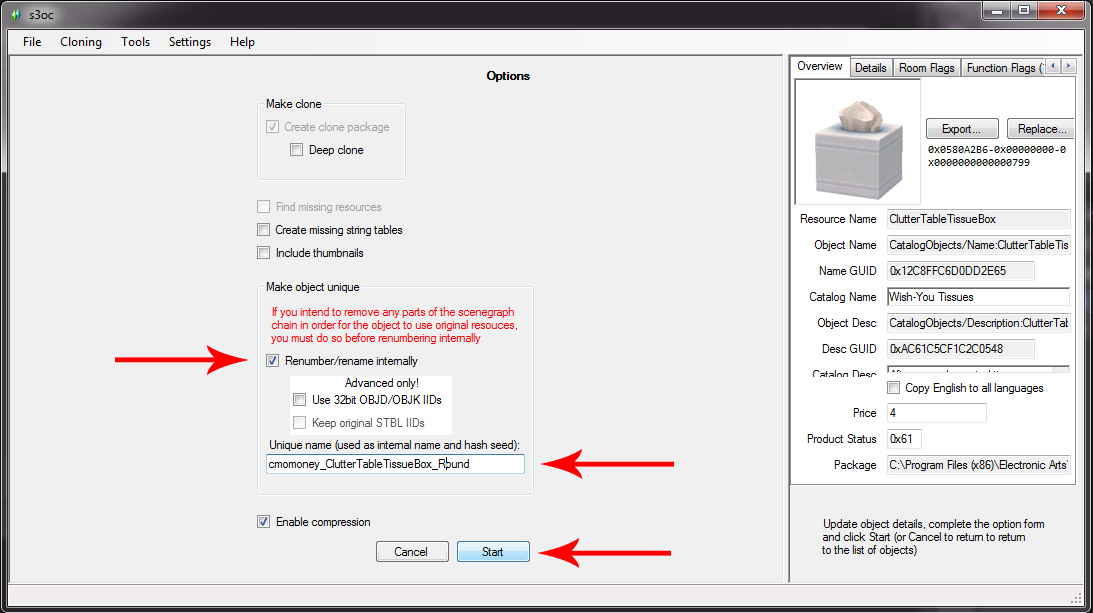 In the new window under Unique Name, Change the name to [yourname]_ClutterTableTissueBox_Round. Make sure that the Renumber box is checked, then Click Start. Navigate to your project folder, give the file a name and press Save. Once it is done, press OK and close s3oc.