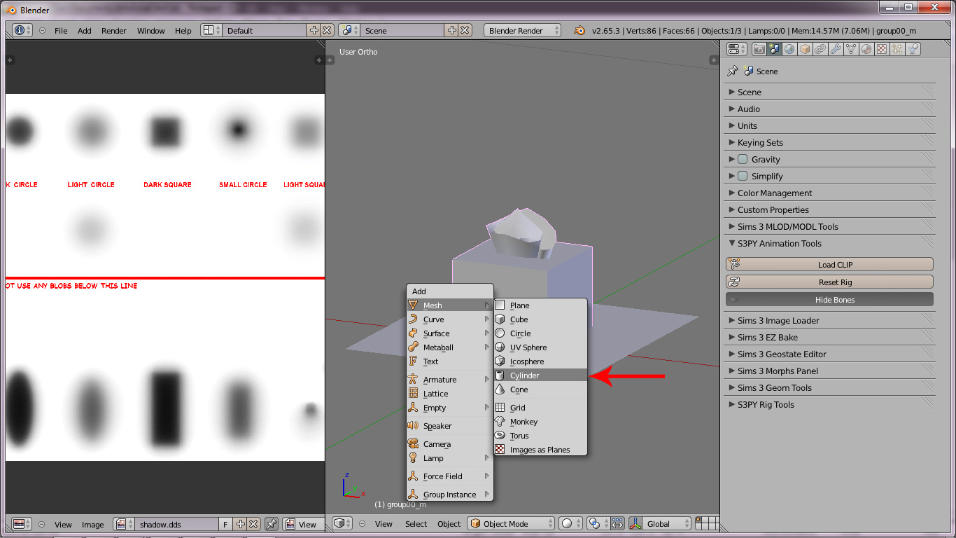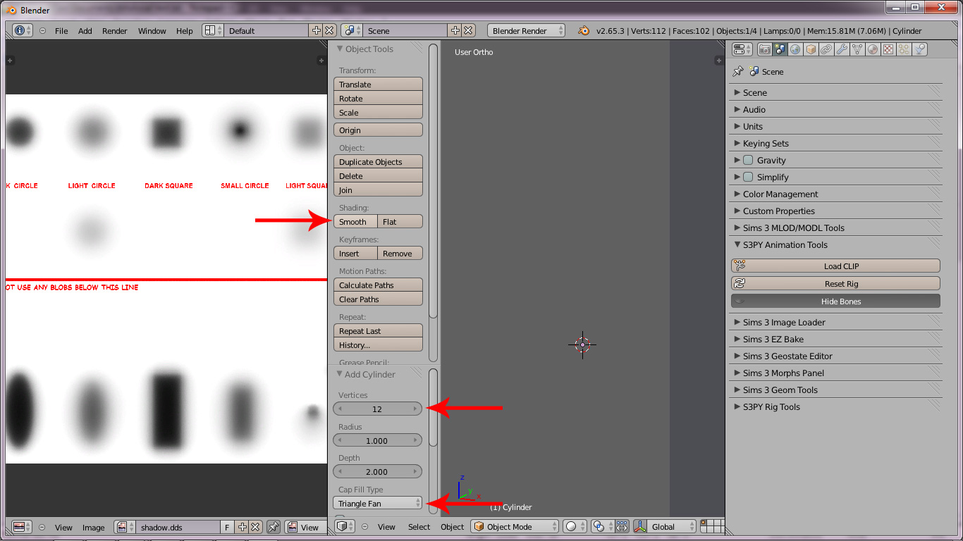 Press T to bring up the tool shelf, and at the bottom under the Add Cylinder options, change Vertices to 12 and Cap Fill Type to Triangle Fan(changes the top and bottom of the cylinder to triangle faces). Also in the Toolshelf under Object Tools, change Shading to Smooth. Press T again to hide the Toolshelf.